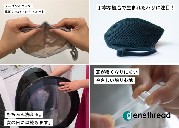 ジーンスレッドマスクはノーズワイヤーと耳ひも調整は標準仕様。スポーツ時でもずれにくくメガネの使用時でも曇りにくい!鼻の上でしっかりカーブに沿ってフィットさせてくれます。また、布でできたソフトな耳ひもが長時間着けていてもストレスがなくラクで、子どもが嫌がらずに着けてくれることで大変喜ばれています!